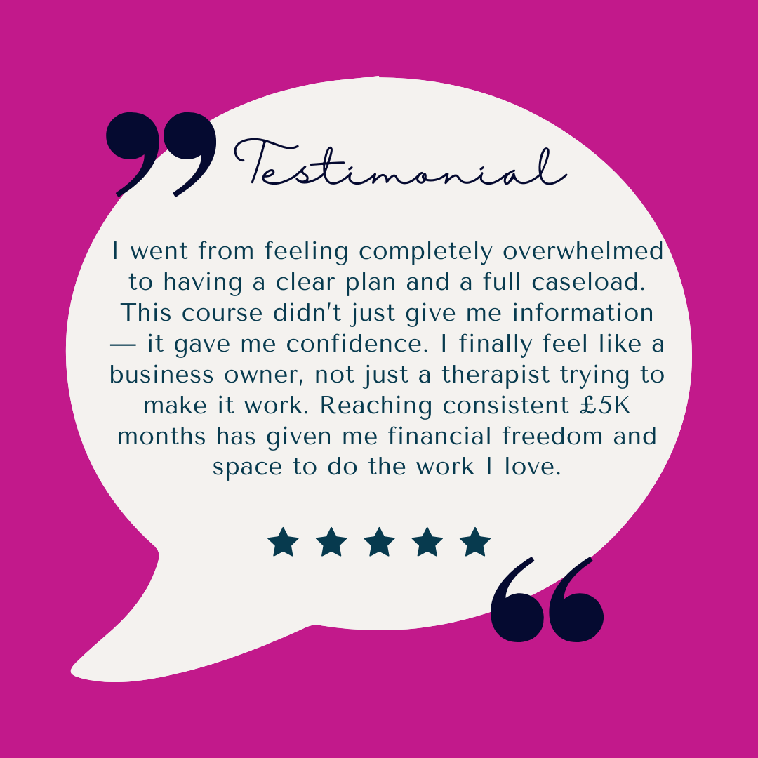 With over a decade of experience running a fully booked private practice, I now consistently earn 5-10k months, working exclusively with self-funding clients.